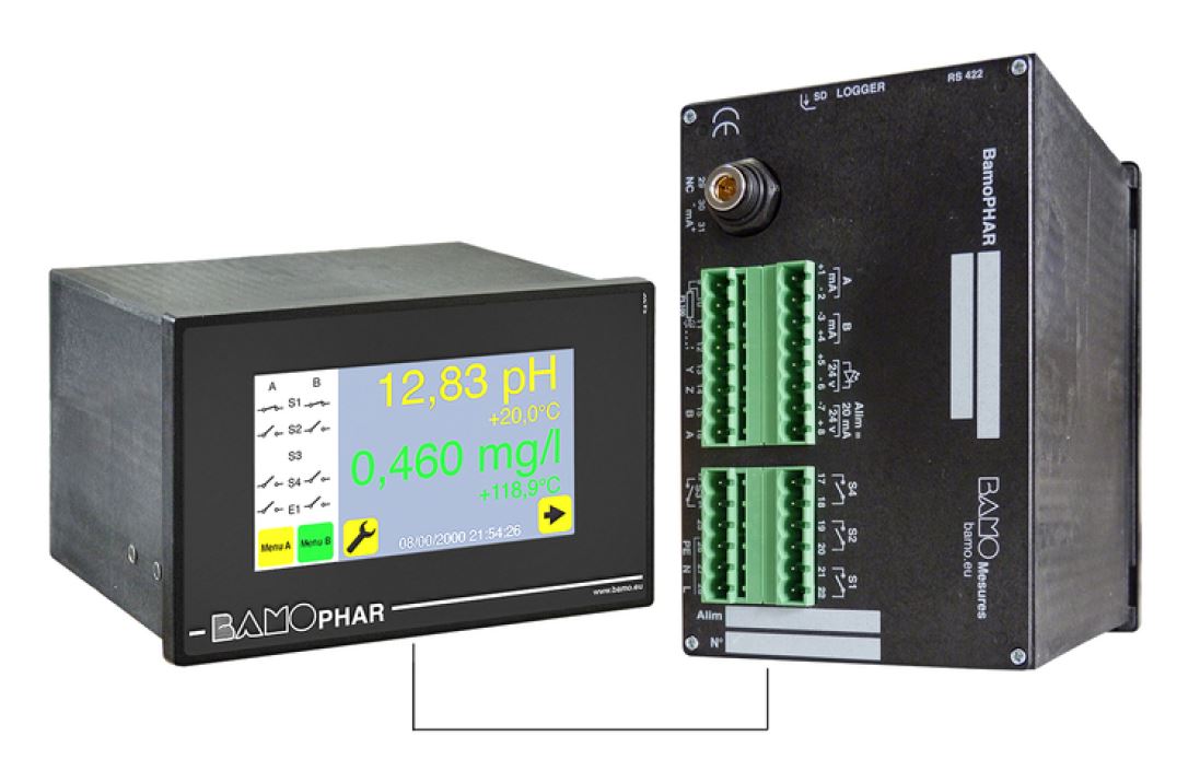 Una unidad de extensión, mural, encastrable o en carril DIN : • - Permite una segunda medición (pH, caudal, conductividad, etc...) (Visualización y programación de medida en modelo base) • Está conectado a la versión base por un cable apantallado de 2 hilos (La longitud máxima de de conexión entre los 2 dispositivos es de 500 m) • - Utiliza el puerto RS 422 e el Logger de versión base