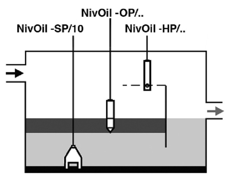El sistema de control NivOil se utiliza para separadores de aceite/líquido ligero. Se utiliza para controlar el nivel de la capa de aceite/líquido ligero que se acumula, el nivel máximo de acumulación si se bloquea el sistema de drenaje y, en caso necesario, la capa de lodo que se deposita en el fondo.